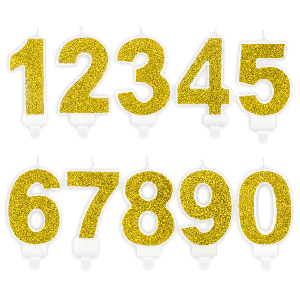 Tårtljus Siffra Guld är snygga tårtljus i de olika siffrorna 0-9 med snyggt glitter-guld på. Ljusen har även en liten plastdel i nederkanten som enkelt håller dem på plats på tårtan.