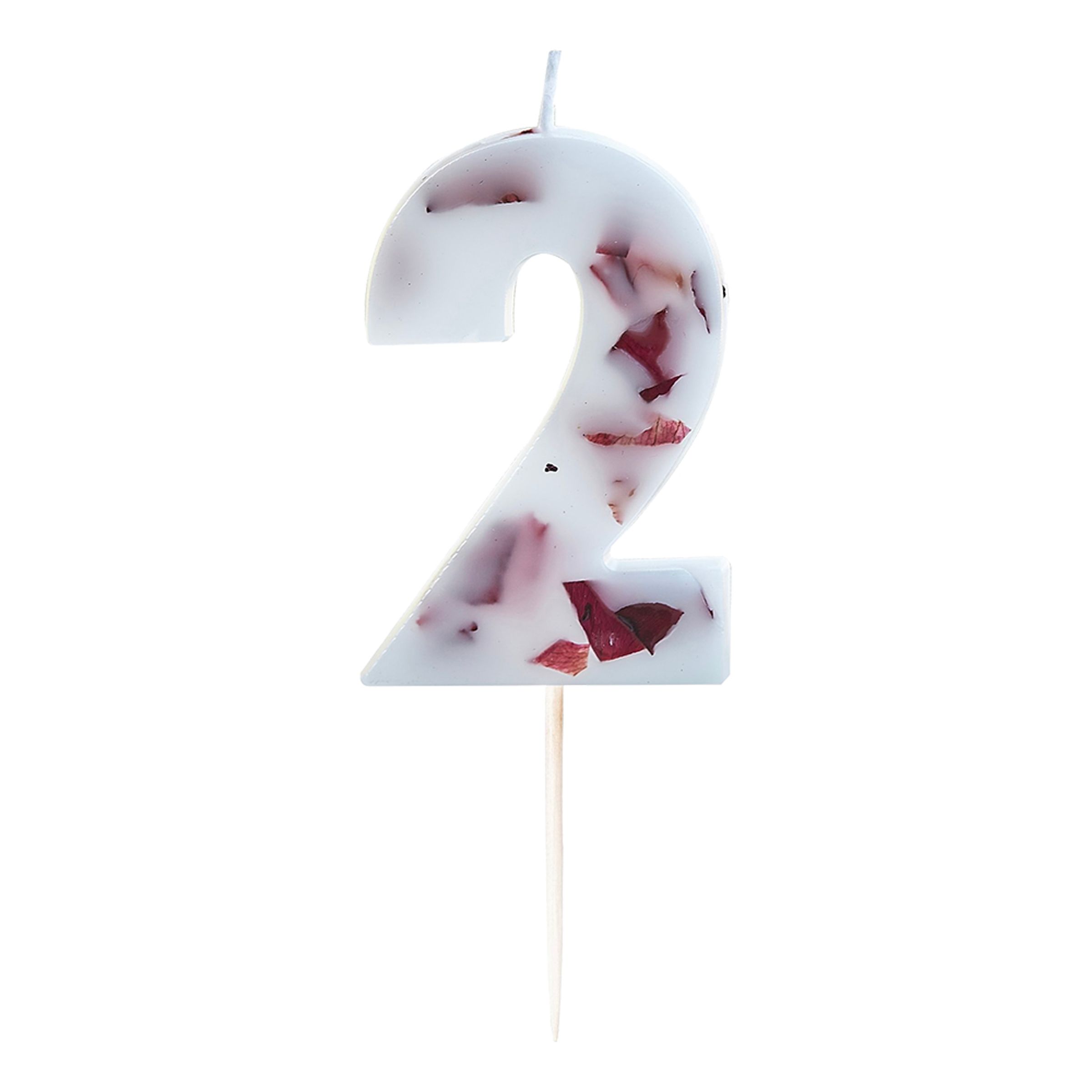 Tårtljus Siffra med Blomblad är fantastiskt vackra ljus i vit färg med torkade blomblad inuti. Ljusen är i form av den siffra du önskar, med en veke på toppen. Ljuset har en liten träpinne under som gör det enkelt att sätta ljuset i tårtan.