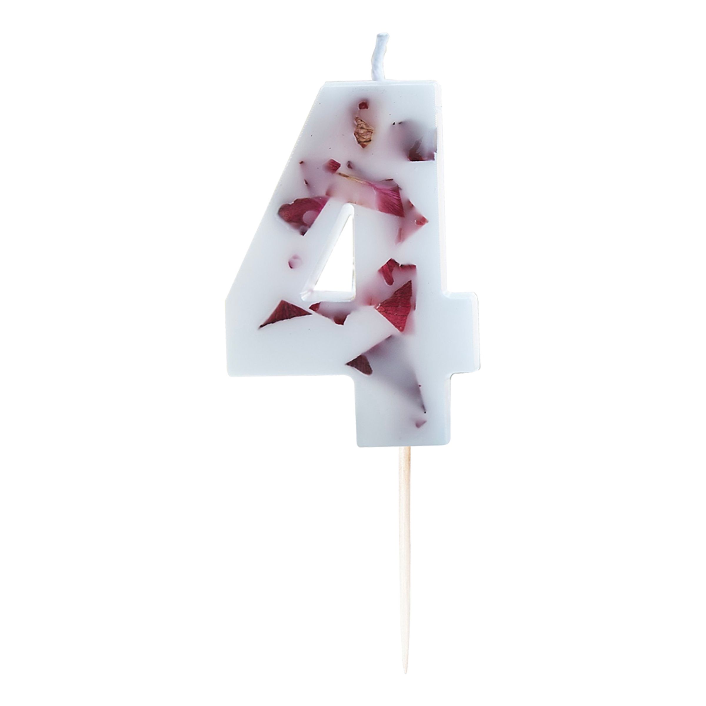 Tårtljus Siffra med Blomblad är fantastiskt vackra ljus i vit färg med torkade blomblad inuti. Ljusen är i form av den siffra du önskar, med en veke på toppen. Ljuset har en liten träpinne under som gör det enkelt att sätta ljuset i tårtan.