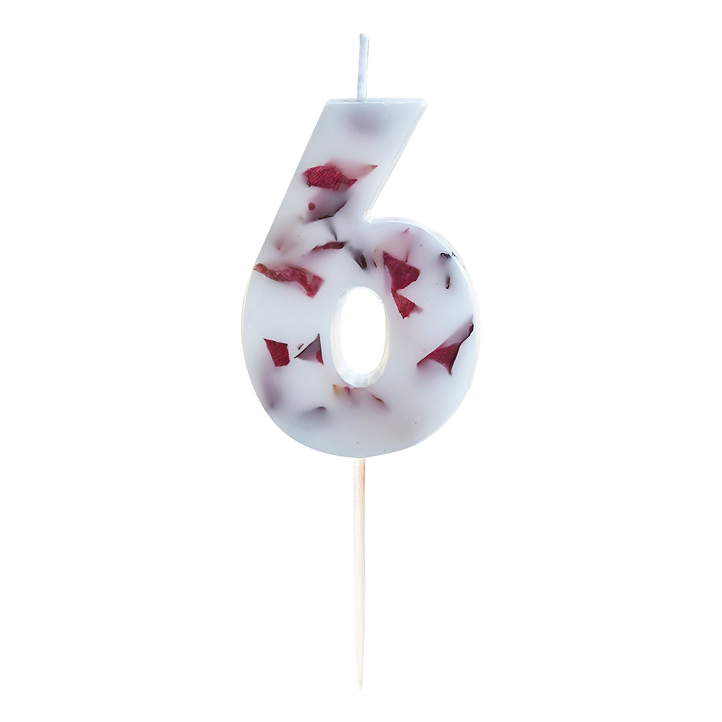 Tårtljus Siffra med Blomblad är fantastiskt vackra ljus i vit färg med torkade blomblad inuti. Ljusen är i form av den siffra du önskar, med en veke på toppen. Ljuset har en liten träpinne under som gör det enkelt att sätta ljuset i tårtan.