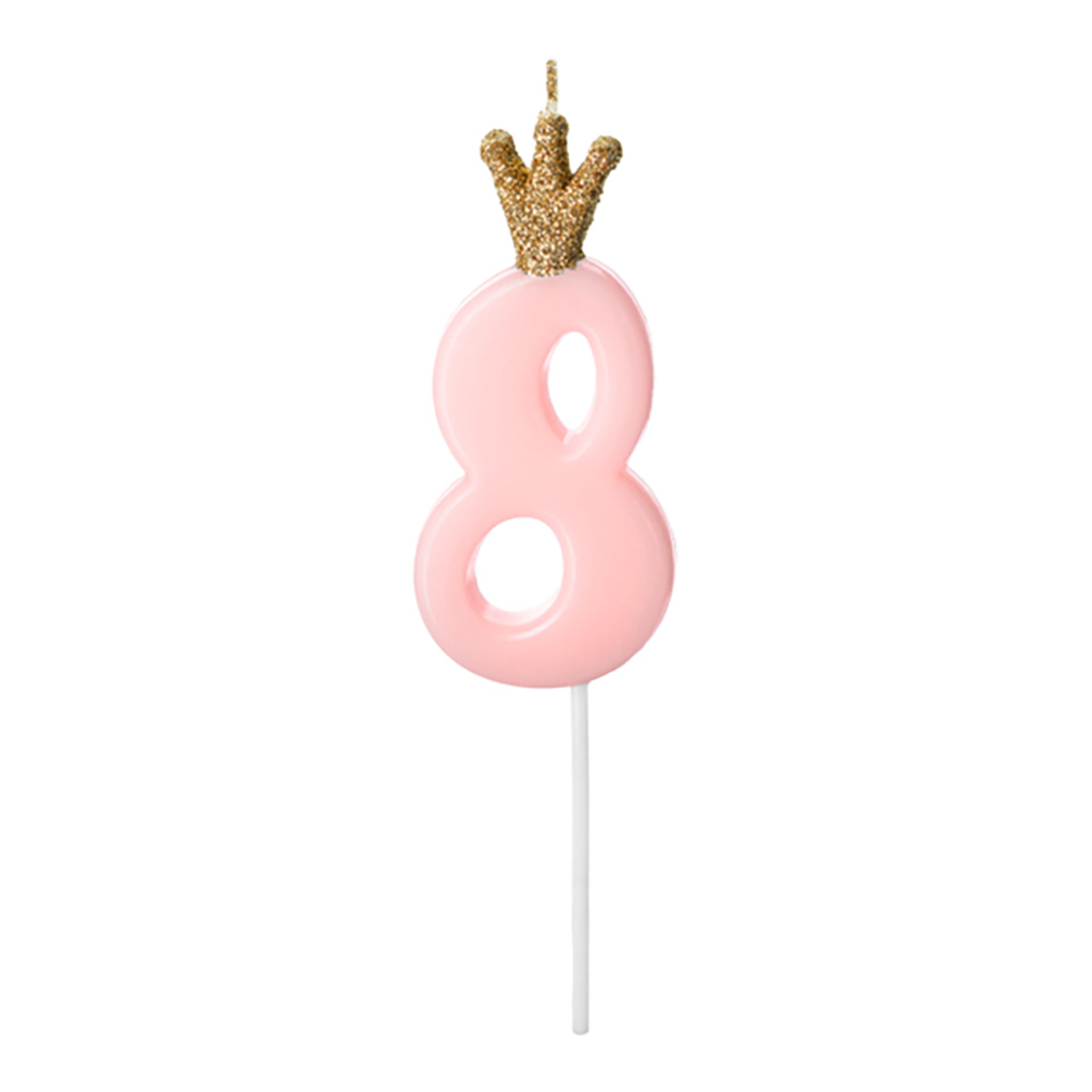 Tårtljus Siffra med Krona Rosa är ett superfint tårtljus i ljusrosa färg med glittrig guldkrona på toppen. Ett måste till födelsedagstårtan!