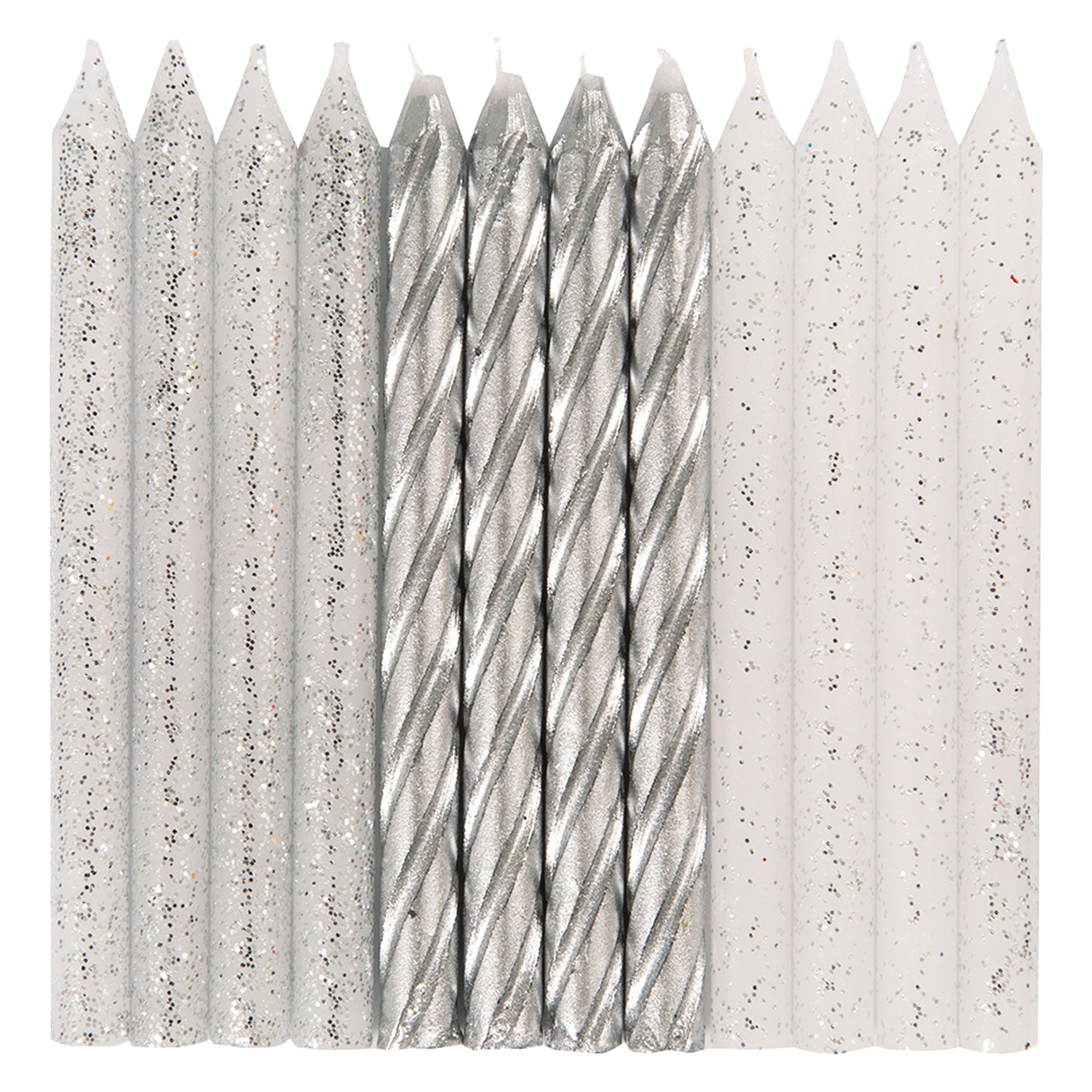Tårtljus Silver/Vit är producerade i stearin och kommer i ett pack om 24 stycken. Passar utmärkt till födelsedagstårtan eller dopet.