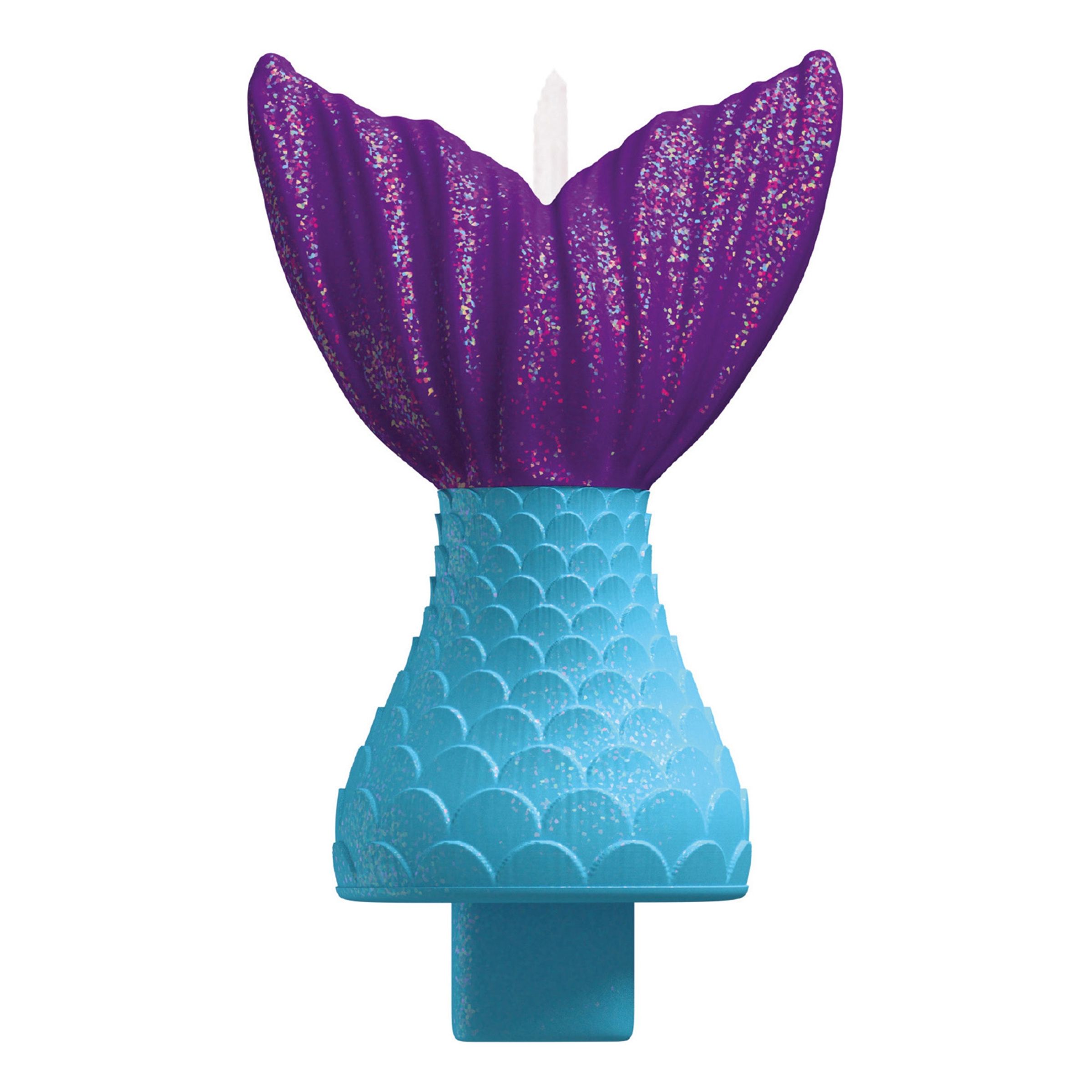 Tårtljus Sjöjungfru består av ett tårtljus format som en sjöjungfrus stjärtfena i blått och lila. En given dekoration att peta ner i tårtan när det vankas kalas med sjöjungfru-tema!