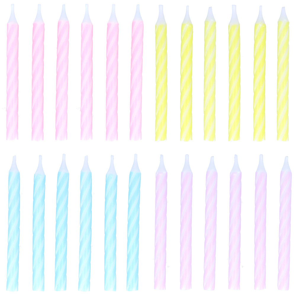 Tårtljus Spiral Pastell omfattar en förpackning med 24 st tårtljus med spiralmönster, ljusen har pastellfärgerna rosa, blå, gul och lila. Medföljer även 12 st pastellfärgade ljushållare i plast.