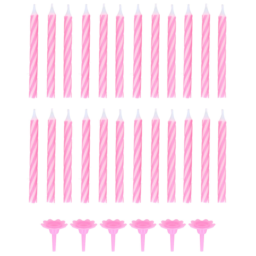 Tårtljus Spiral Rosa med Hållare omfattar en förpackning med 24 st vita tårtljus som har ett rosa spiralmönster runt sig. Kommer även med 12 st rosa ljushållare i plast som är utformade som en blomma.