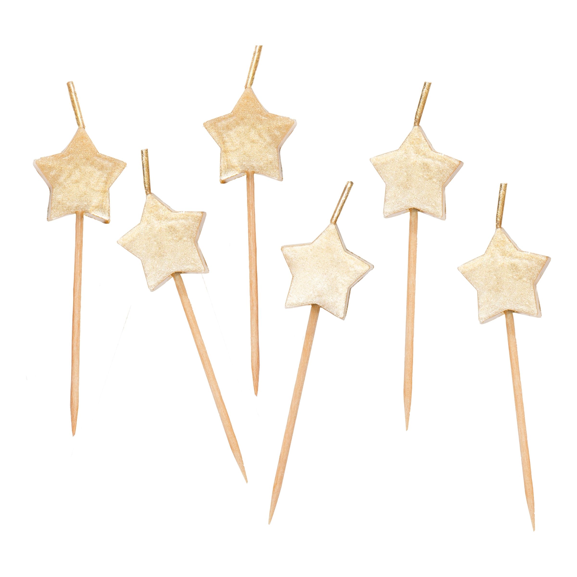 Tårtljus Stjärnor Guld inkluderar sex guldfärgade tårtljus formade som stjärnor. Tårtljusen är enkla att sticka ner i tårtor, cupcakes och andra bakverk. De kan användas på till exempel ett barnkalas, en bröllopsfest eller på en babyshower. Det är bara tårtljusen som ingår inget annat som syns på bilderna.