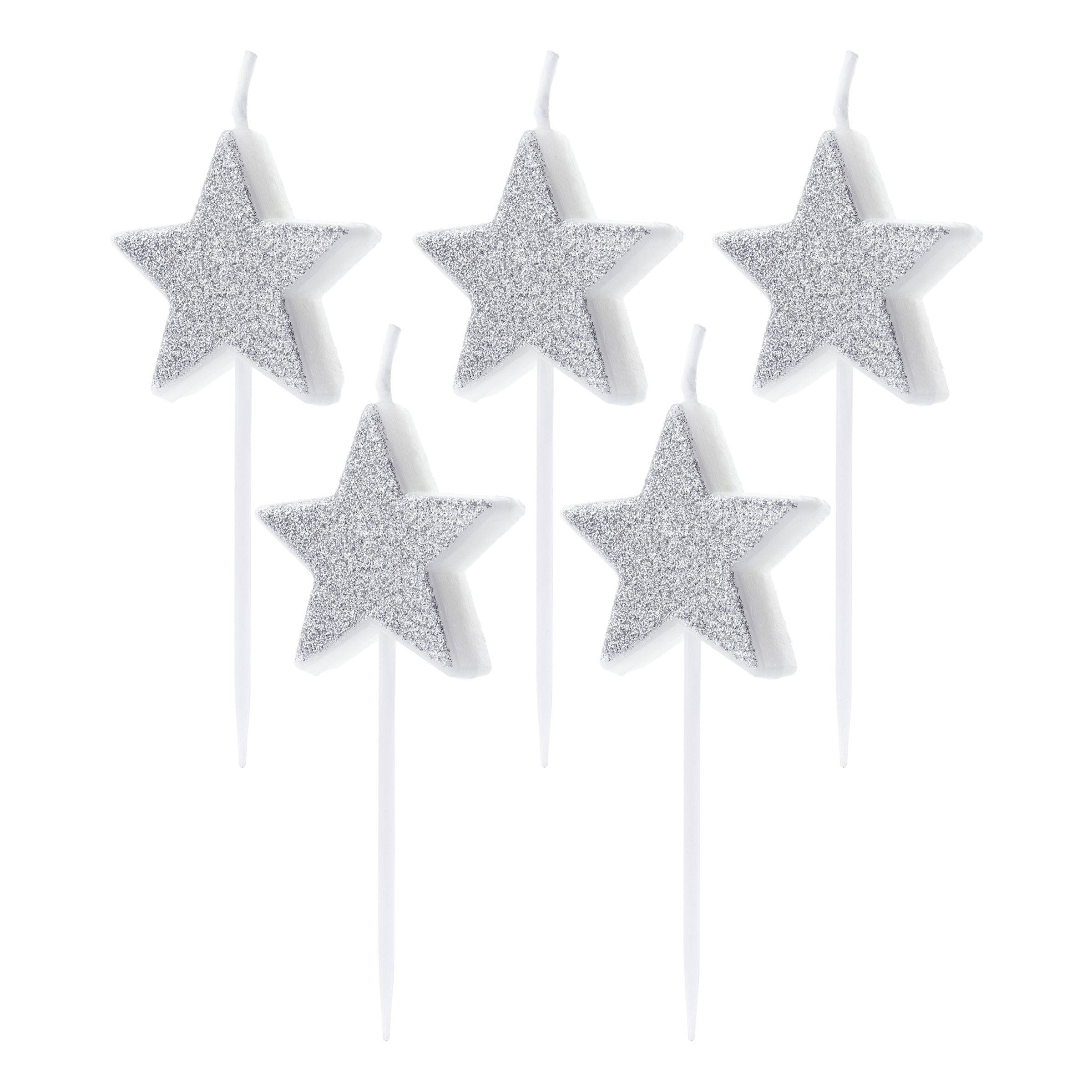 Tårtljus Stjärnor Silver är fem tårtljus i form av stjärnor i glittrande silver som gör de extra snygga. Passar lika bra till födelsedagstårtan som till muffins, cupcakes och andra mumsiga bakelser!