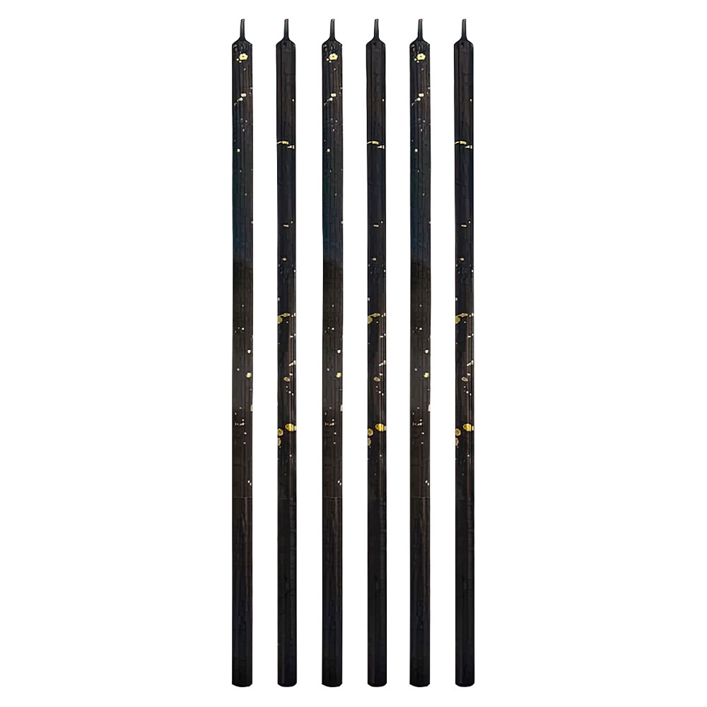 Tårtljus Svart och Guld omfattar smala, svarta tårtljus med dekorativa detaljer i guld. Tårtljusen är 16,5 cm långa och kommer i 6-pack.