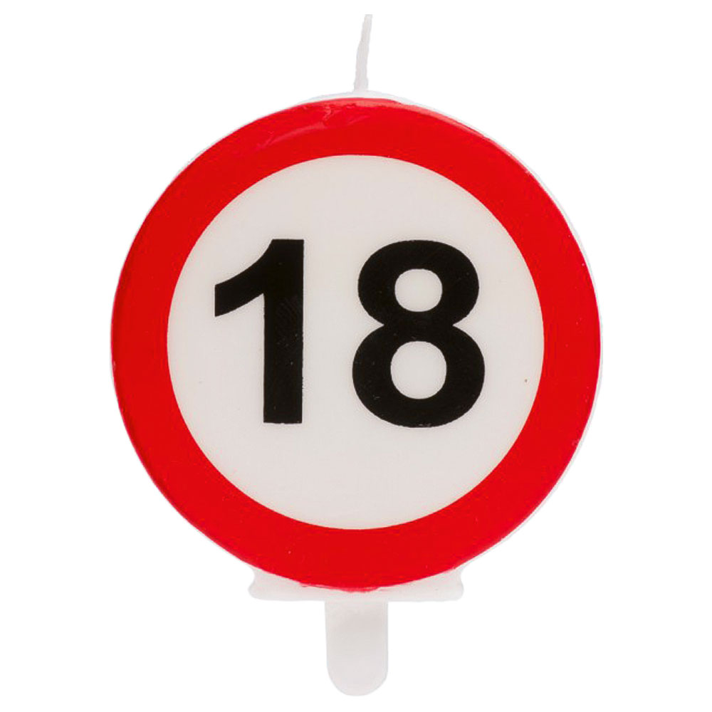 Tårtljus Trafikskylt 18 omfattar ett runt tårtljus i vitt, rött och svart som föreställer en trafikskylt med siffran "18" på. Tårtljuset är ca 6,5 cm stort och har även en liten plast-pinne nedtill som gör det enklare att sätta ner det i tårtan.