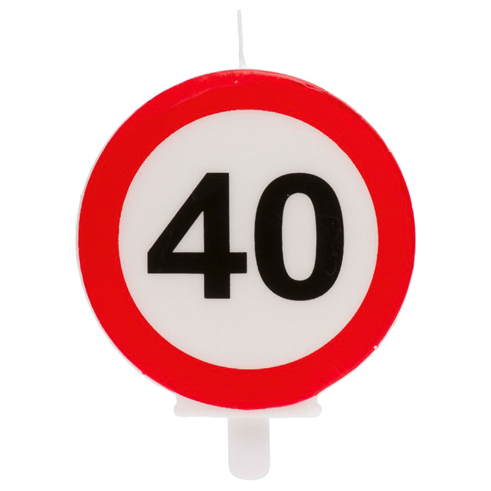 Tårtljus Trafikskylt 40 omfattar ett runt tårtljus i vitt, rött och svart som föreställer en trafikskylt med siffran "40" på. Tårtljuset är ca 6,5 cm stort och har även en liten plast-pinne nedtill som gör det enklare att sätta ner det i tårtan.