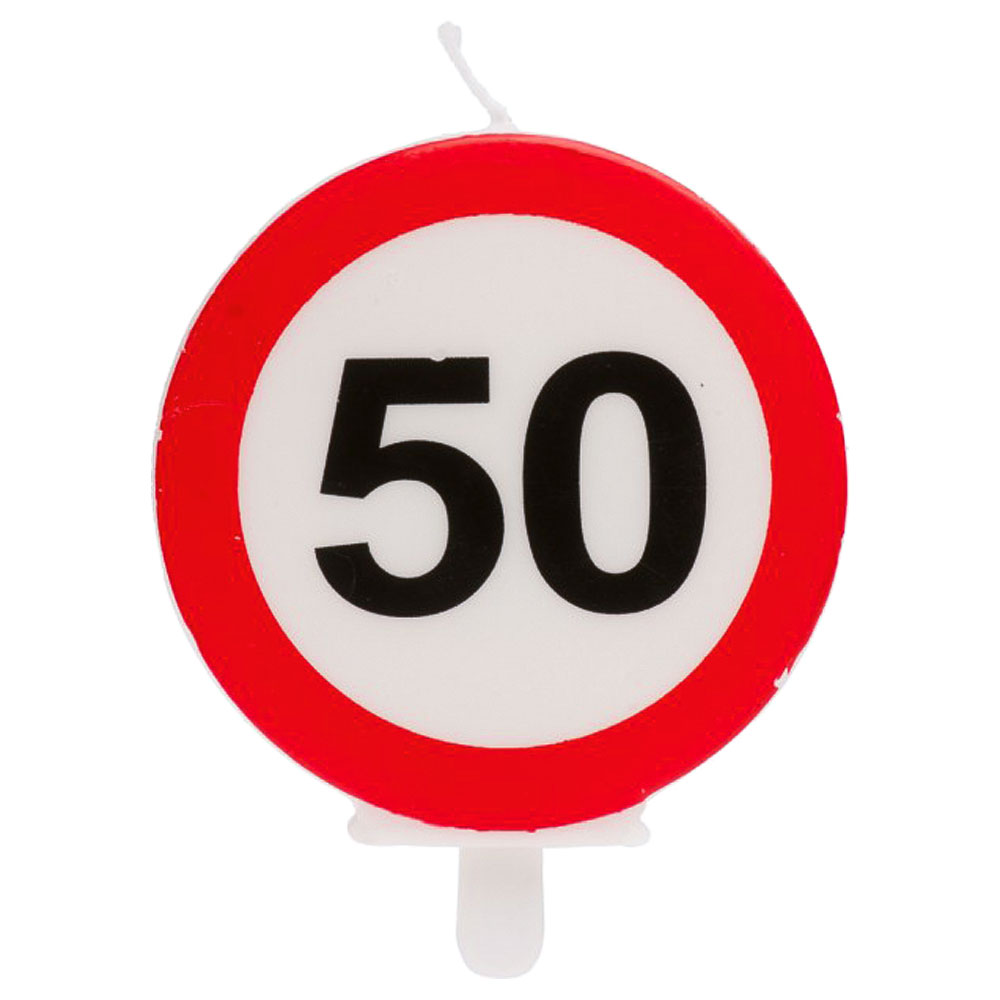 Tårtljus Trafikskylt 50 omfattar ett runt tårtljus i vitt, rött och svart som föreställer en trafikskylt med siffran "50" på. Tårtljuset är ca 6,5 cm stort och har även en liten plast-pinne nedtill som gör det enklare att sätta ner det i tårtan.