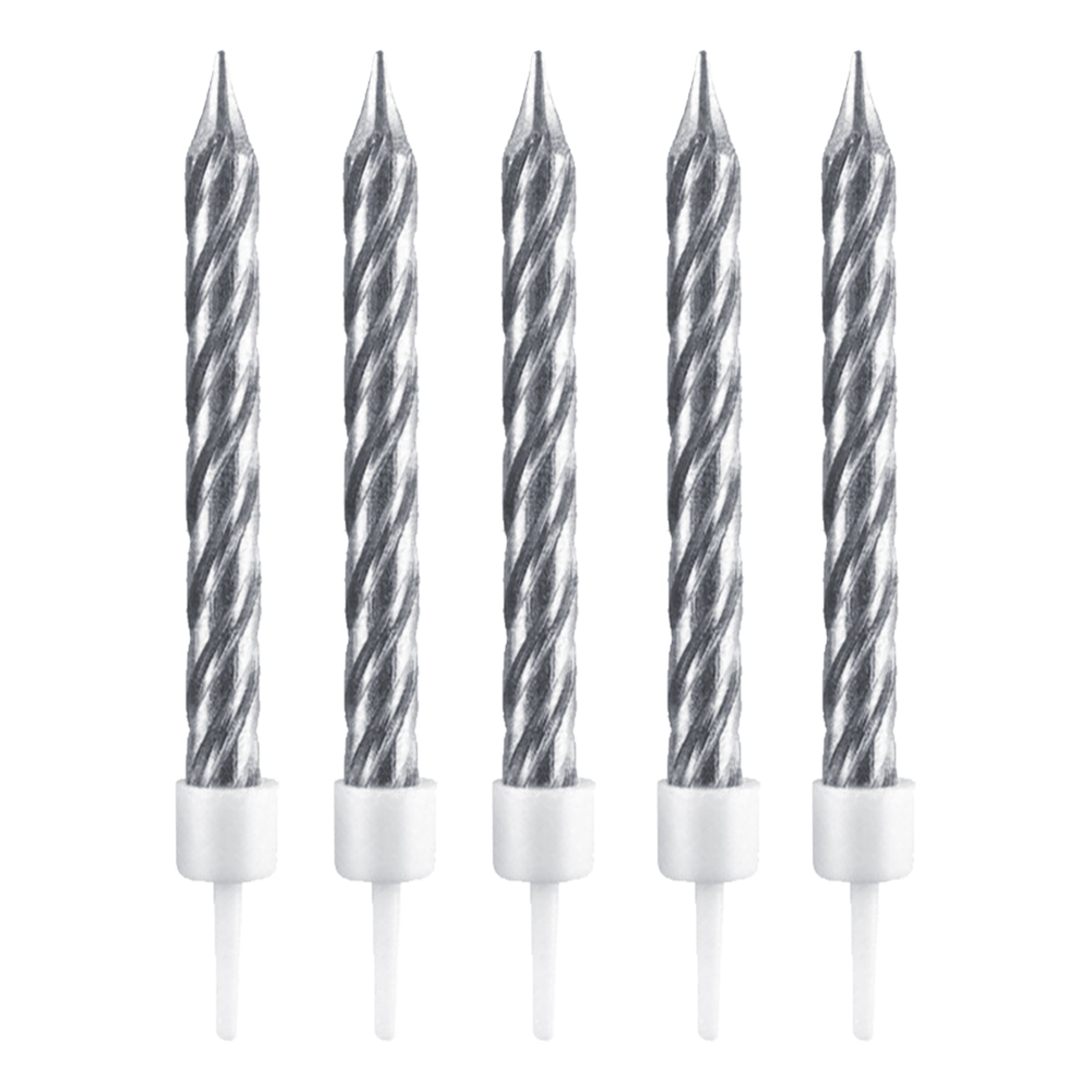 Tårtljus Vridna Silver levereras i 10-pack med vita hållare till varje ljus.