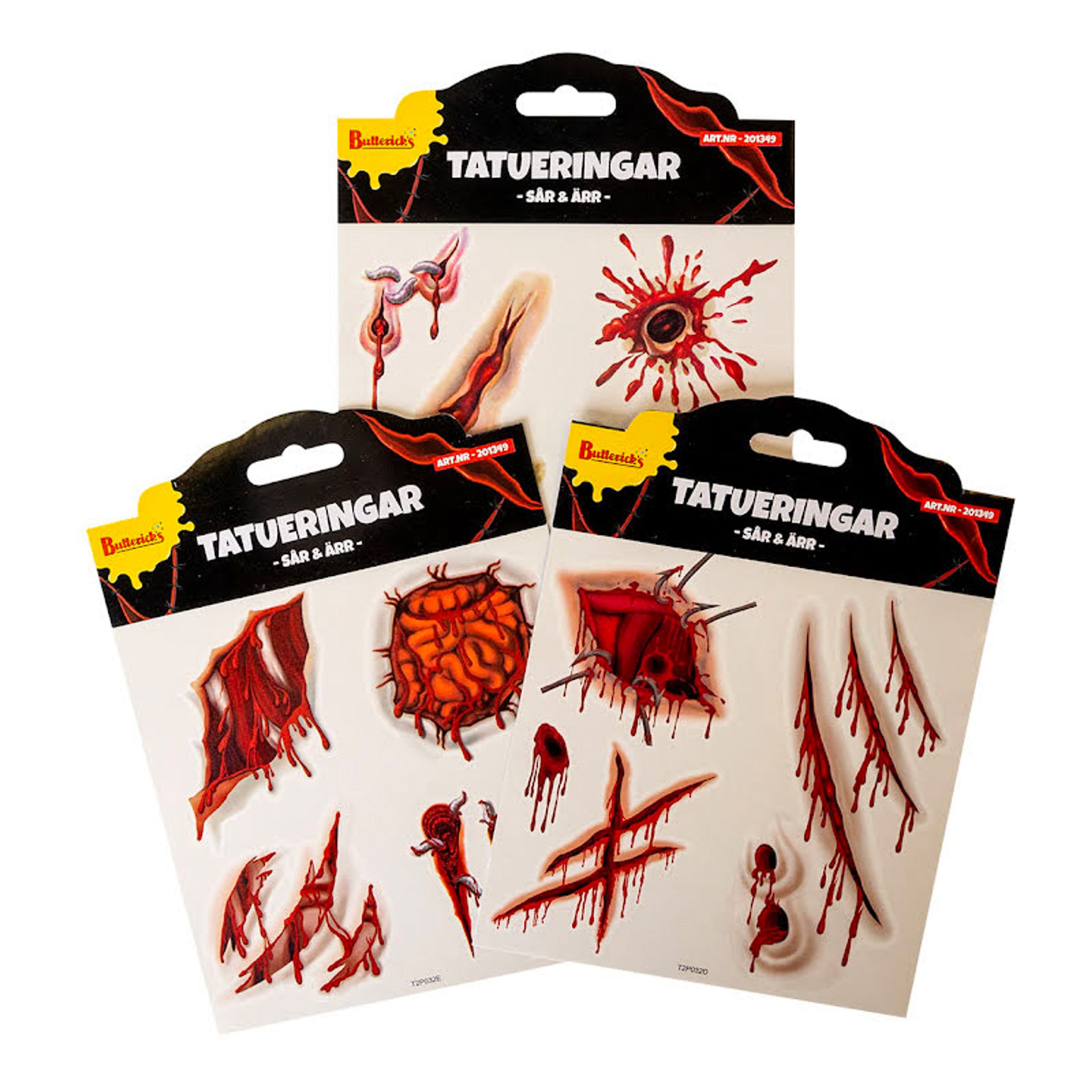 Tatuering Sår & Ärr är riktigt effektfulla gnuggisar som kan lura vem som helst att du varit med om en fatal olycka. Observera att bladen säljs styckvis och osorterade – det blir alltså en överraskning vilken variant du får!