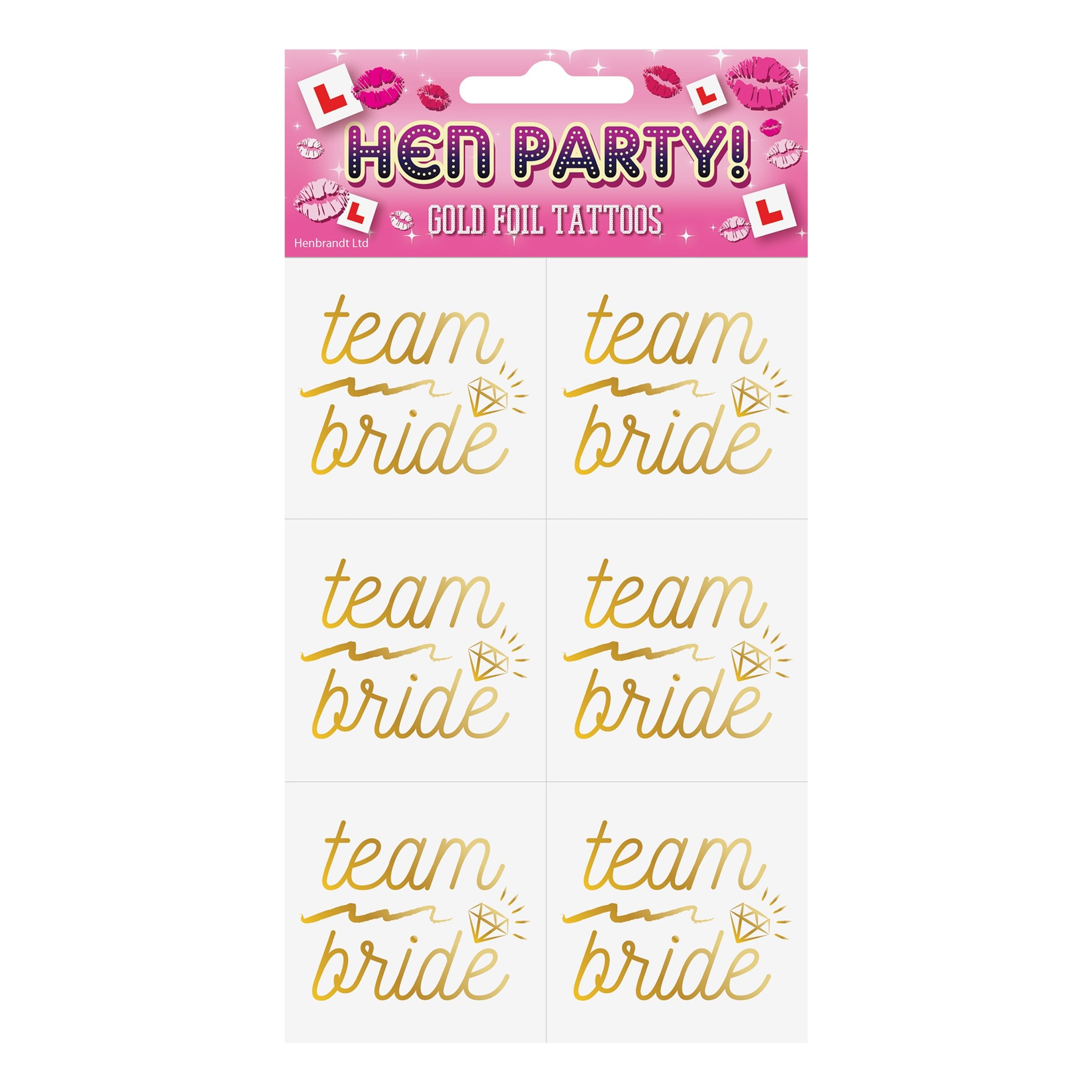 Tatuering Team Bride innehåller sex stycken engångstatueringar som kommer med texten "team bride" skrivet i guld. Tatueringarna är enkla att applicera på huden (instruktioner medföljer) och går att tvättas bort med vanlig tvål och vatten.