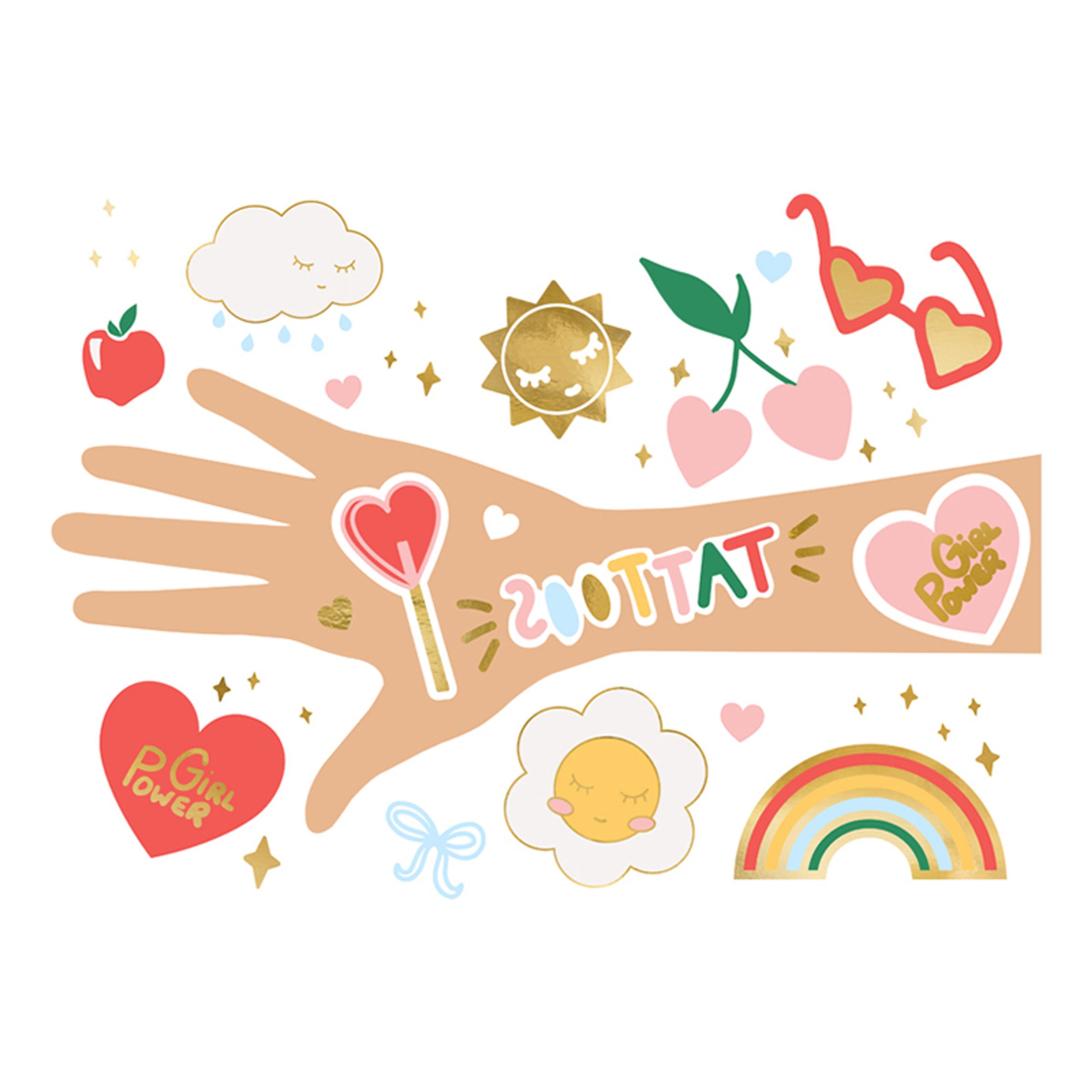 Färggranna fejktatueringar är alltid lika roliga att pryda sig med då de inte gör det minsta ont och dessutom går smidigt att ta bort ifall man tröttnar eller ångrar sig. Här får du ett helt gäng temporära tatueringar med färgsprakande Girl Power-tema – superkul till barnkalaset, tjejkvällen eller pyjamaspartyt! Tatueringarna är lika enkla att gnugga på som att tvätta av, så kidsen kan variera sig efter humör.