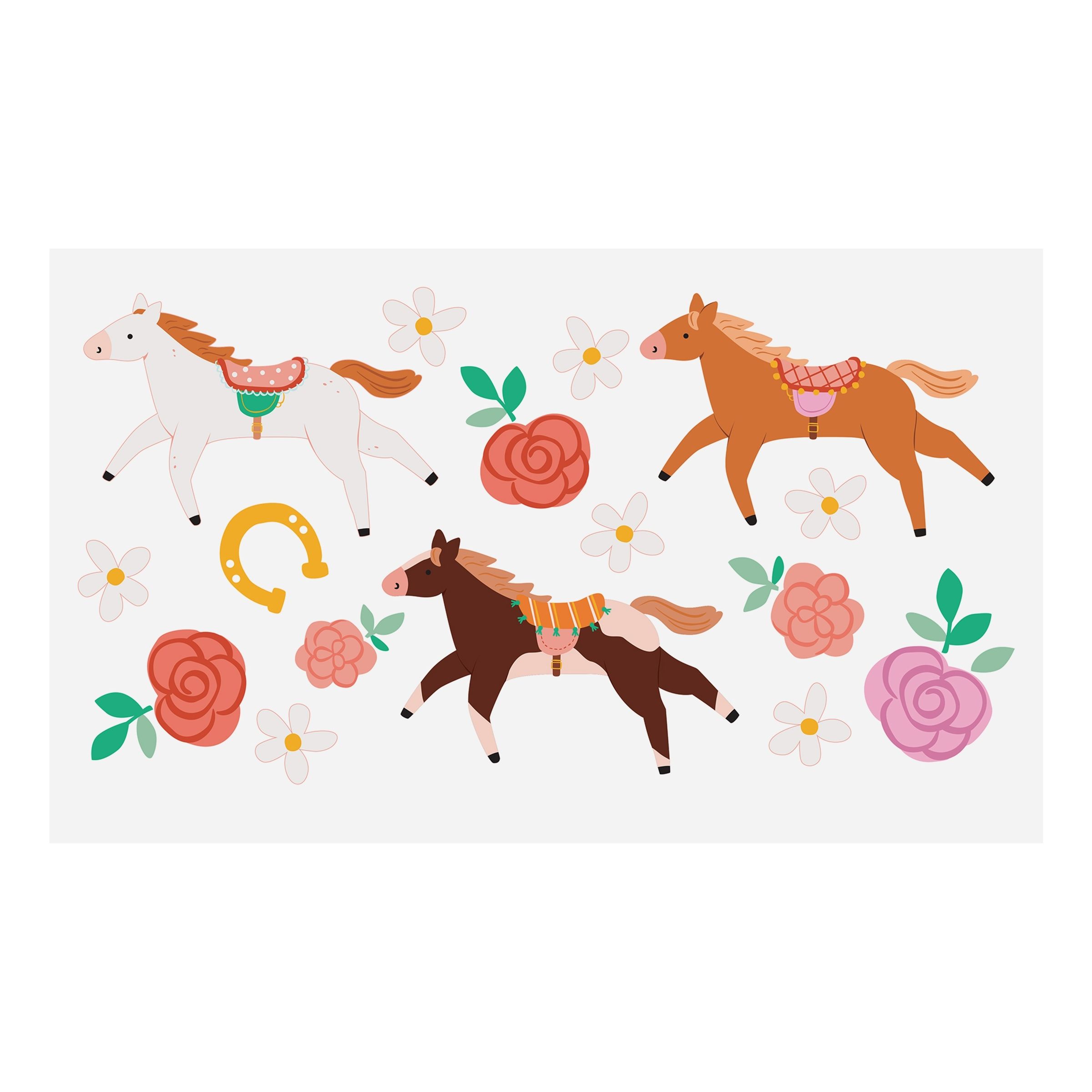 Tatueringar Hästar inkluderar sexton stycken temporära tatueringar / gnuggisar som alla kommer med motiv föreställande hästar, hästskor och blommor. Perfekt att använda som en kul aktivitet på barnkalaset med hästtema!