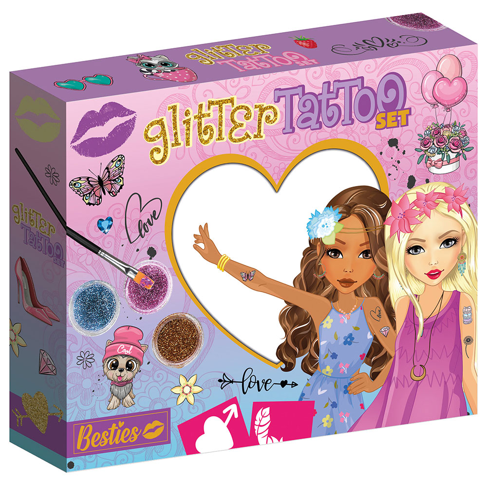 Tatueringar & Nagelkit 18-pack omfattar ett tatueringset med tre ark med hundra fyra temporära tatueringar, fem stenciler, två ark med sextiofyra nagelklistermärken, ett nagellim, två penslar samt fem burkar med glitter i färgerna lila, rosa, turkos, gul och silver.