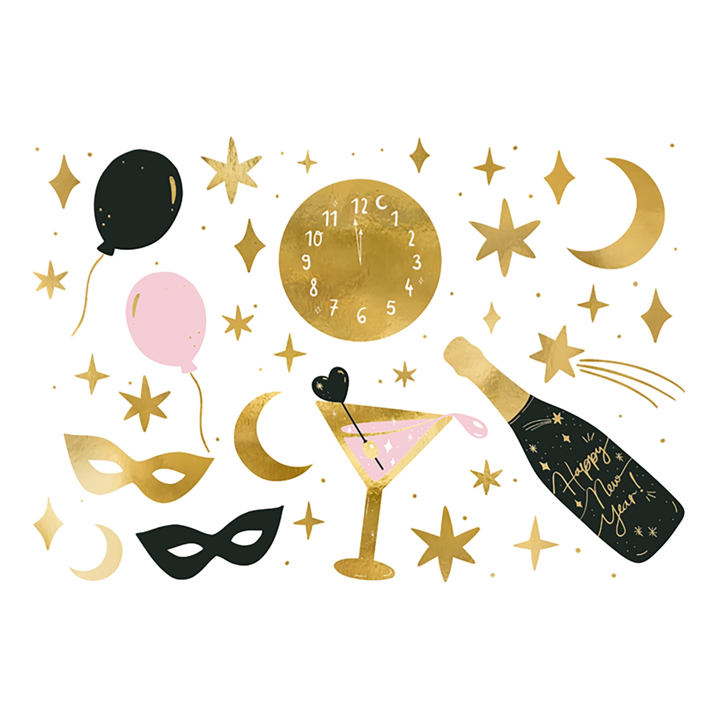Tatueringar Nyår inkluderar ett ark med totalt tio olika designs i form av klockor, ballonger, martiniglas, champagneflaskor, stjärnor, månar och ansiktsmasker. Tatueringarna appliceras snabbt och smärtfritt på huden genom att fukta baksidan av arket och tvättas lätt bort med tvål och vatten