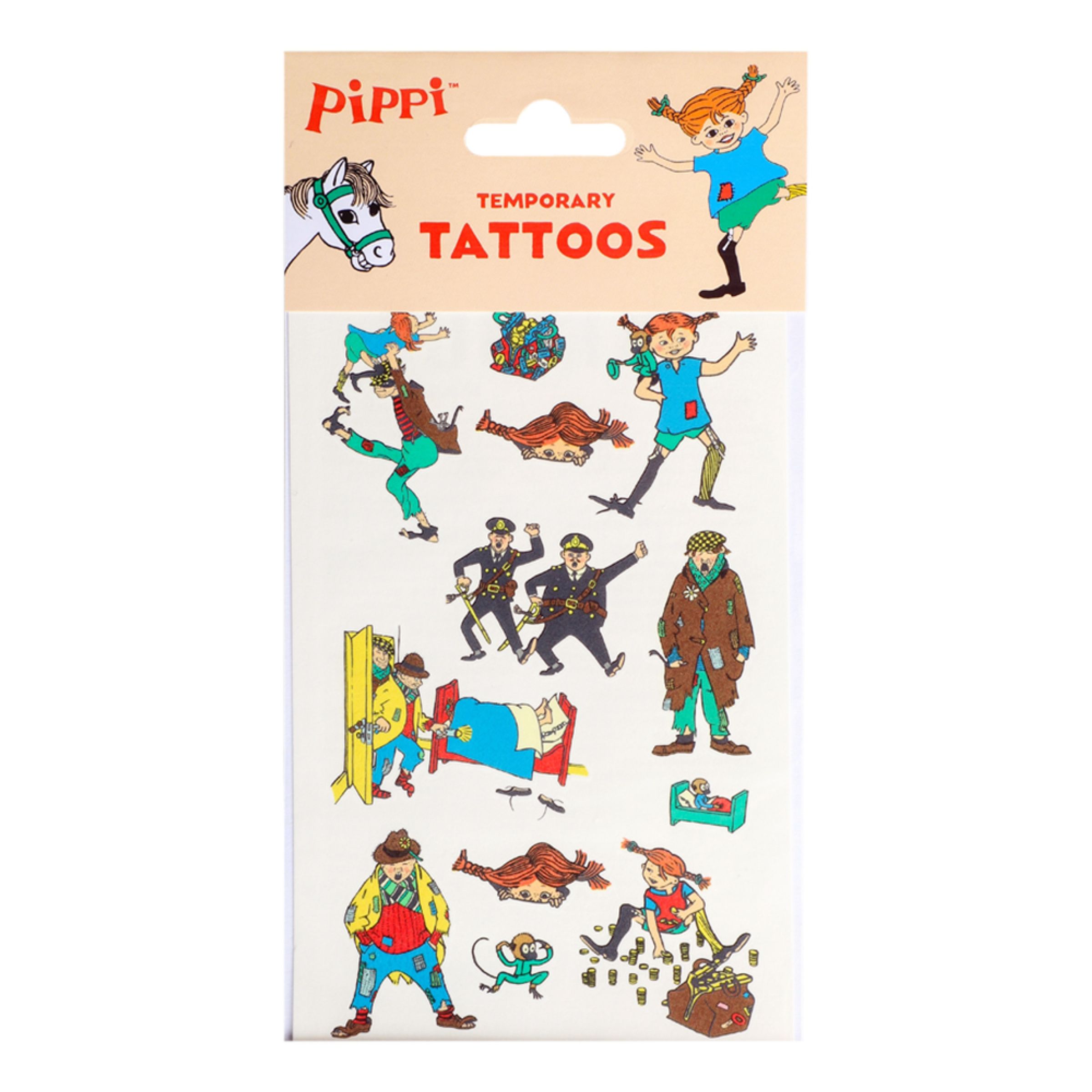 Tatueringar Pippi Långstrump inkluderar tolv stycken gnuggisar som alla kommer med motiv hämtat från Astrid Lindgrens Pippi Långstrump. Perfekt som en rolig aktivitet till barnkalaset med Pippi-tema!