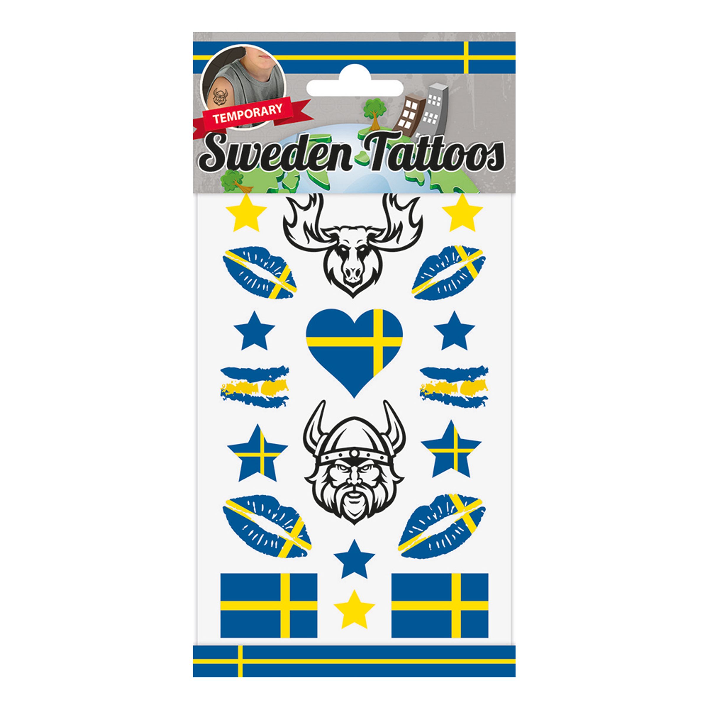 Tatueringar Sverige är fejktatueringar i svenska flaggans färger i olika utföranden. Fästes enkelt på huden med hjälp av till exempel en blöt svamp. Tatueringarna kommer på ett ark som är 15 x 10 cm. Totalt 19 st tatueringar.
