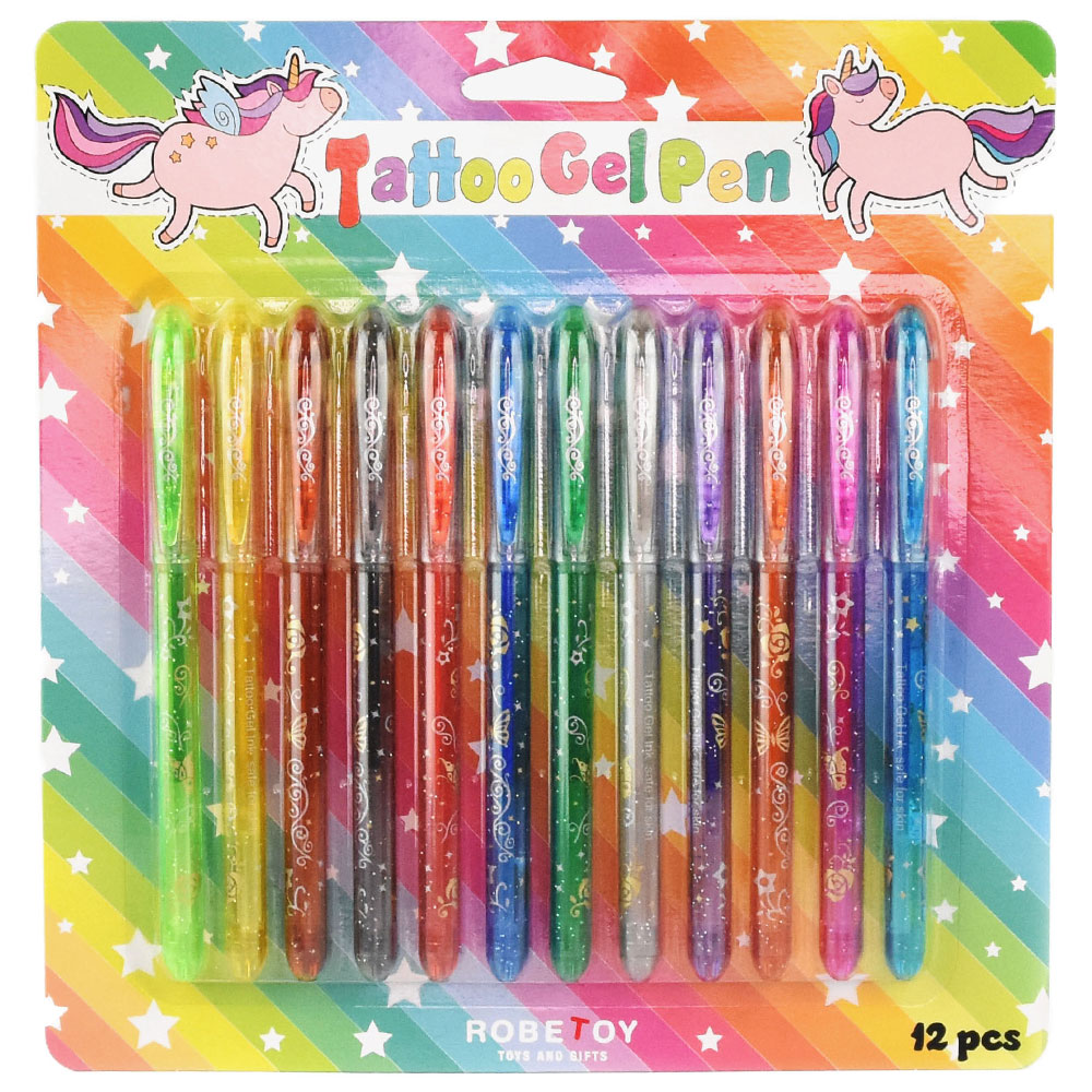 Tatueringspennor 12-Pack omfattar tolv stycken gel tatueringspennor i olika färger. Pennorna går att måla fritt med direkt på huden.