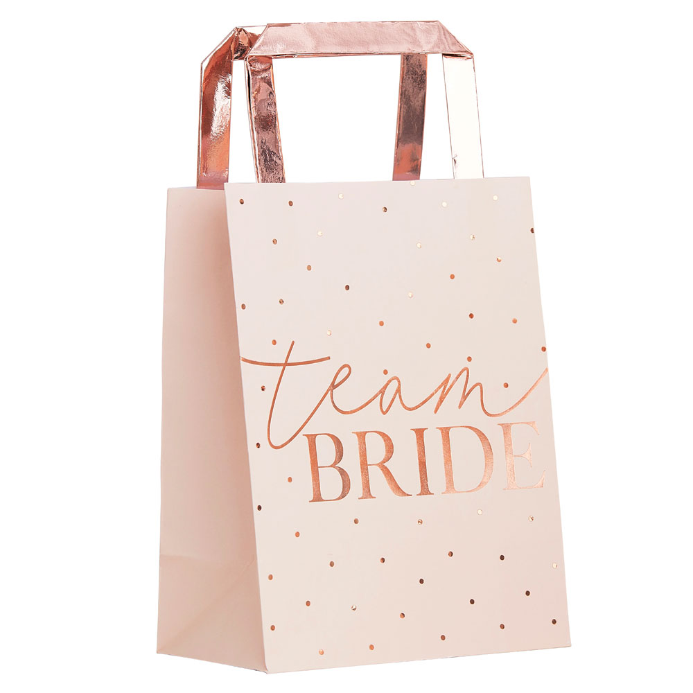 Team Bride Kalaspåsar omfattar pastell ljusrosa pappåsar med texten "Team Bride" och prickar i roséguld. Påsarna har även roséguldiga handtag.