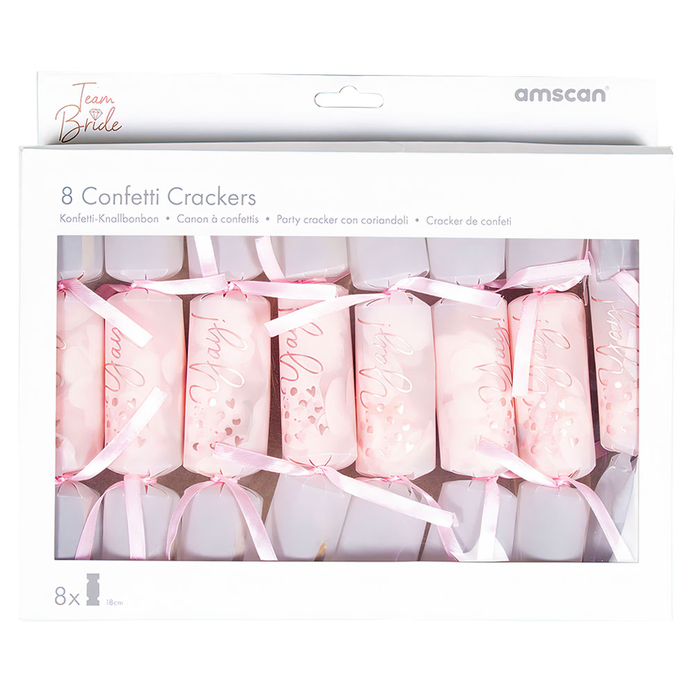 Team Bride Konfetti Crackers omfattar ett kit med 8 stycken konfetti crackers med rosa konfetti, transparent hölje med rosa sidenband, texten "Yay!" och motiv av hjärtan i glansigt rosa. När crackersen delas flödar konfettin ut.