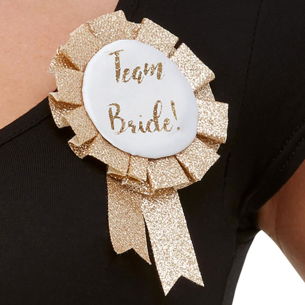 Team Bride Rosett omfattar en rosett i vitt och guld med texten "Team Bride!" i roseguld, rosetten har en säkerhetsnål för att fästas med.