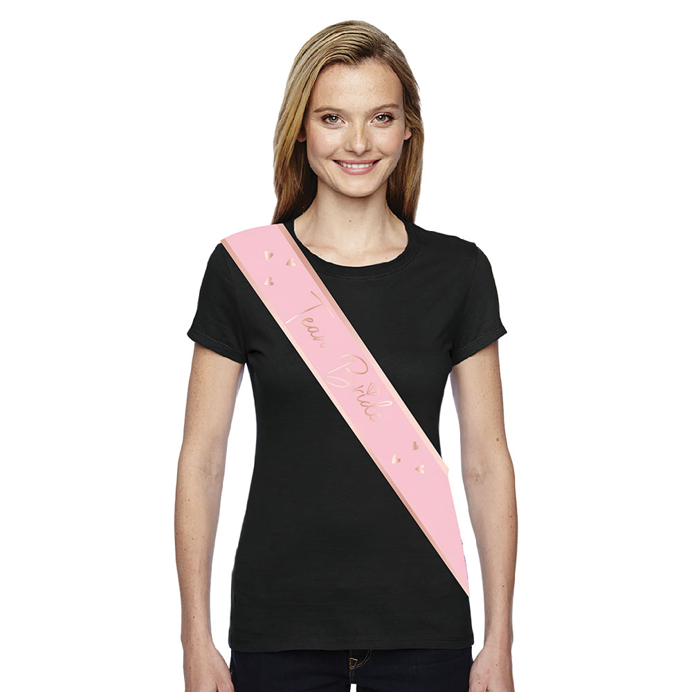 Team Bride Sash Rosa och Guld omfattar ett kit med sex stycken ordensband i rosa med guldkanter, texten "Team Bride" i guldig skrivstil och guldiga hjärtan. Banden är i folie och säljs i 6-pack.