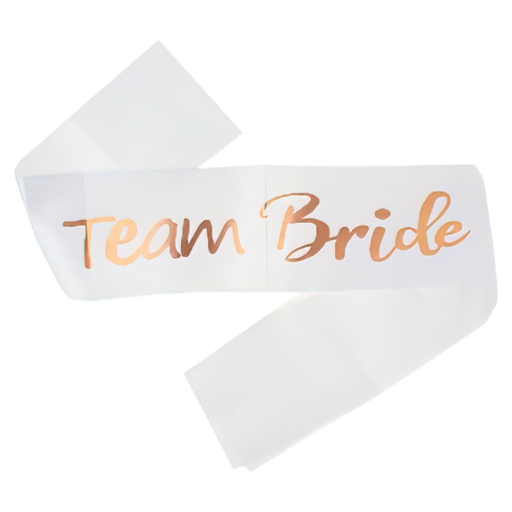 Team Bride Sash omfattar ett vitt ordensband med texten "Team Bride" i skimrande roséguld. Bandet är tillverkat av polyester och är ca 80 cm långt samt 9,5 cm brett.