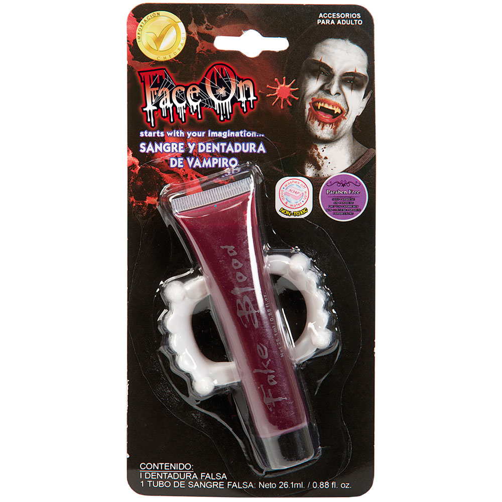 Teaterblod med Vampyrtänder omfattar ett set med ett par vampyrtänder av plast samt en tub med 26 ml rött låtsasblod. Blodet kan appliceras direkt från tuben och tvättas enkelt bort med tvål och vatten.