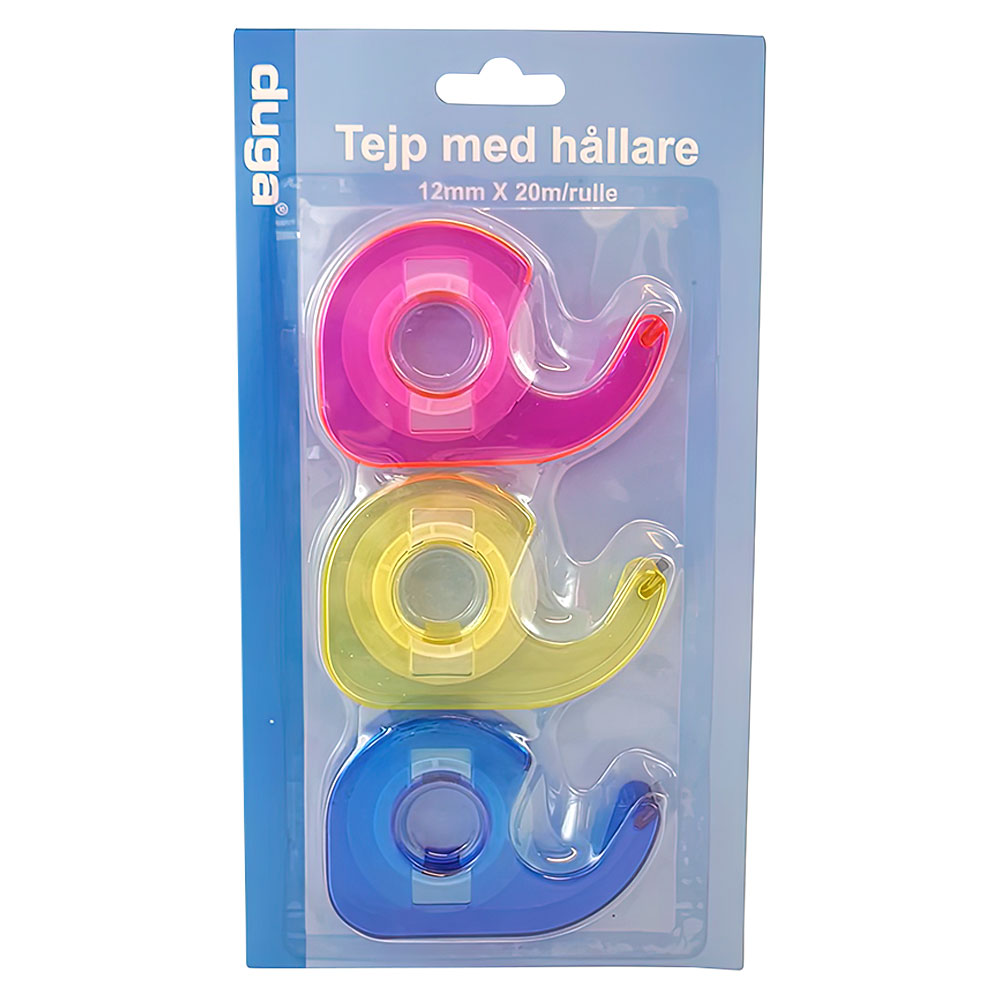 Tejp med Hållare 3-Pack omfattar tre stycken tejphållare med tejp. Tejphållarna kommer i färgerna rosa, gul och blå. Tejprullarna har 20 meter tejp på vardera rulle och mäter ungefär 12 millimeter breda.