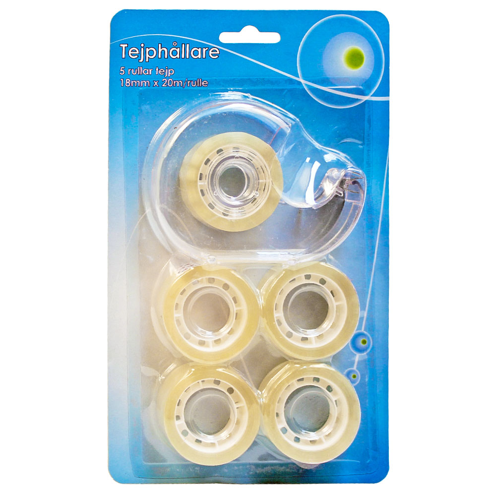 Tejphållare och Tejp består av kontorstejp med hållare. En rulle tejp mäter 1,8 centimeter i bredd och 200 centimeter i längd. Tillverkad av plast. Förpackningen innehåller en hållare samt 5 stycken rullar med tejp.