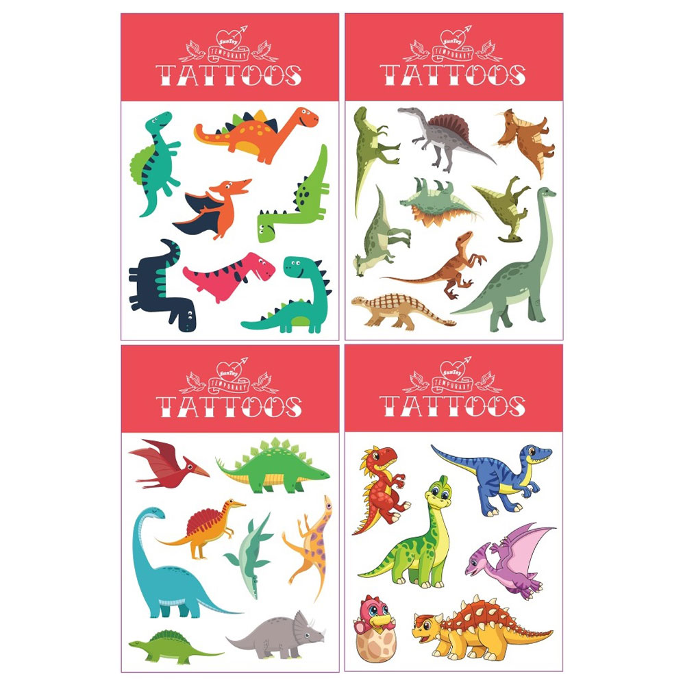 Temporära Tatueringar Dinosaurier omfattar 4 stycken ark med söta dinosaurie tatueringar i olika färger. Instruktioner för att applicera tatueringarna finns på förpackningen.
