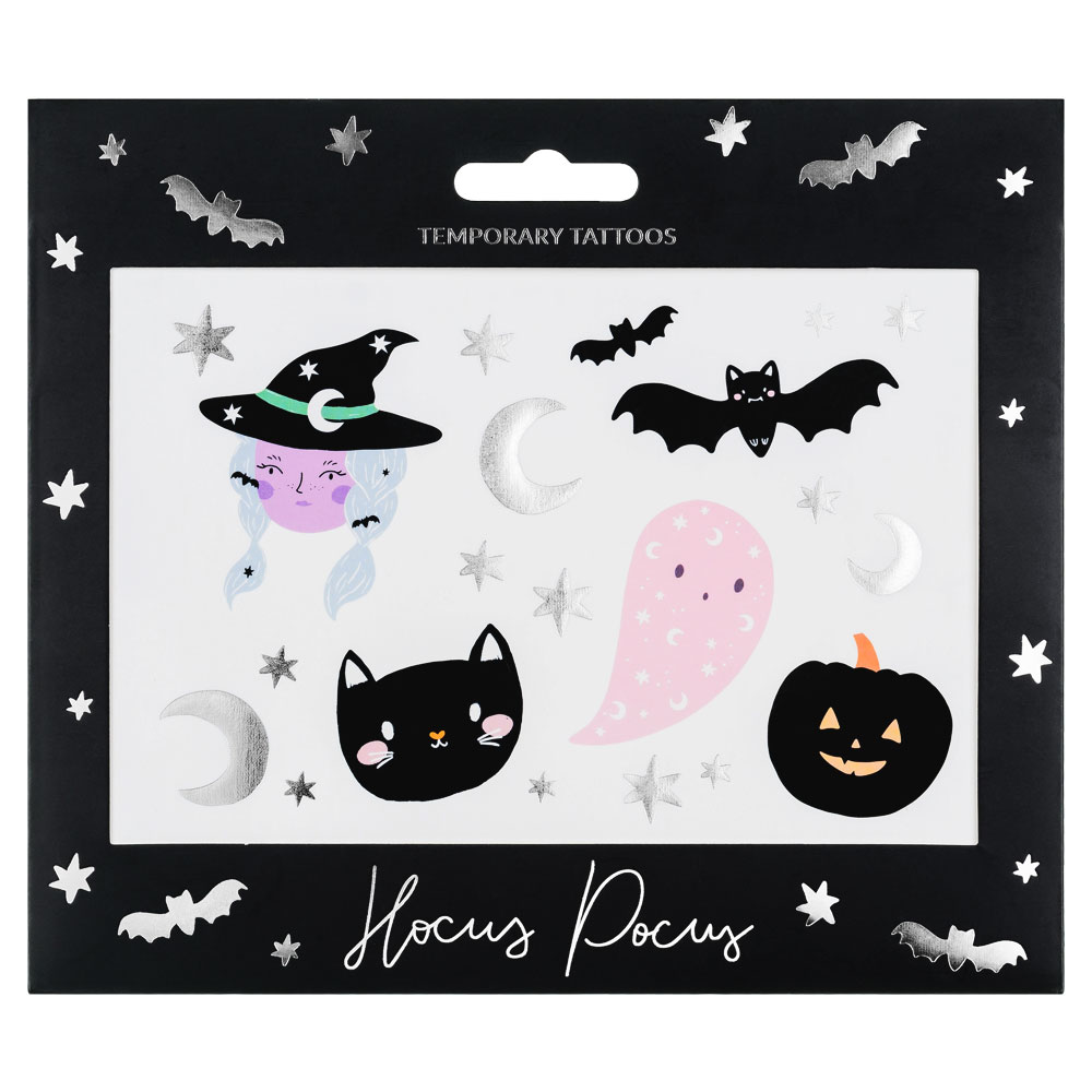 Söta låtsas-tatueringar med snyggt Halloween motiv, perfekt för alla barn som vill ha både fina och coola gnuggis tatueringar till kalas och party. Med dessa häftiga gnuggisar får ditt barn en cool Halloween look på nolltid, ett måste för alla som gillar temporära tatueringar med häxor och fladdermöss.