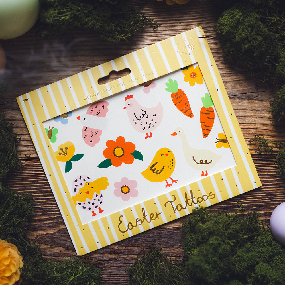 Temporära Tatueringar Påsk omfattar ett ark med 18 stycken gnuggis tatueringar med olika påsk- och vårmotiv. Instruktioner medföljer.