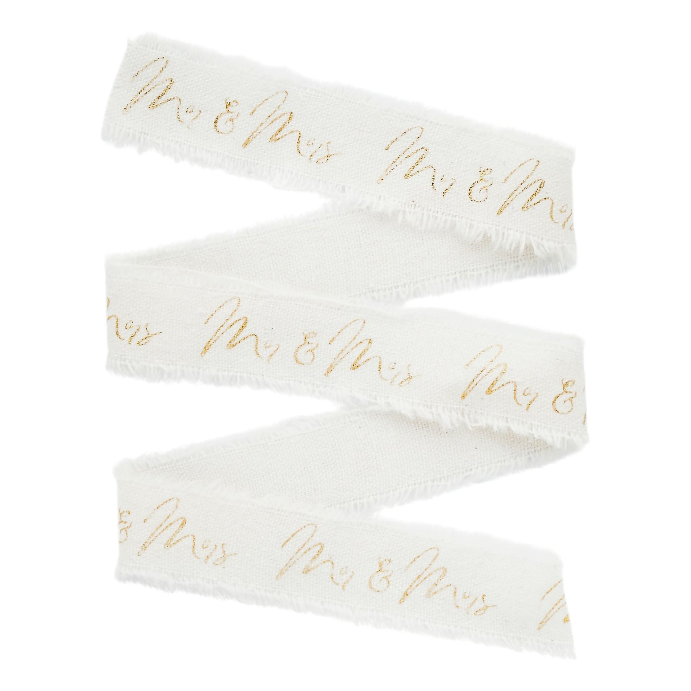 Textilband Mr & Mrs Guld innehåller ett vitt band som pryds av den gyllene texten "Mr & Mrs". Ett perfekt band att inreda bröllopet med!