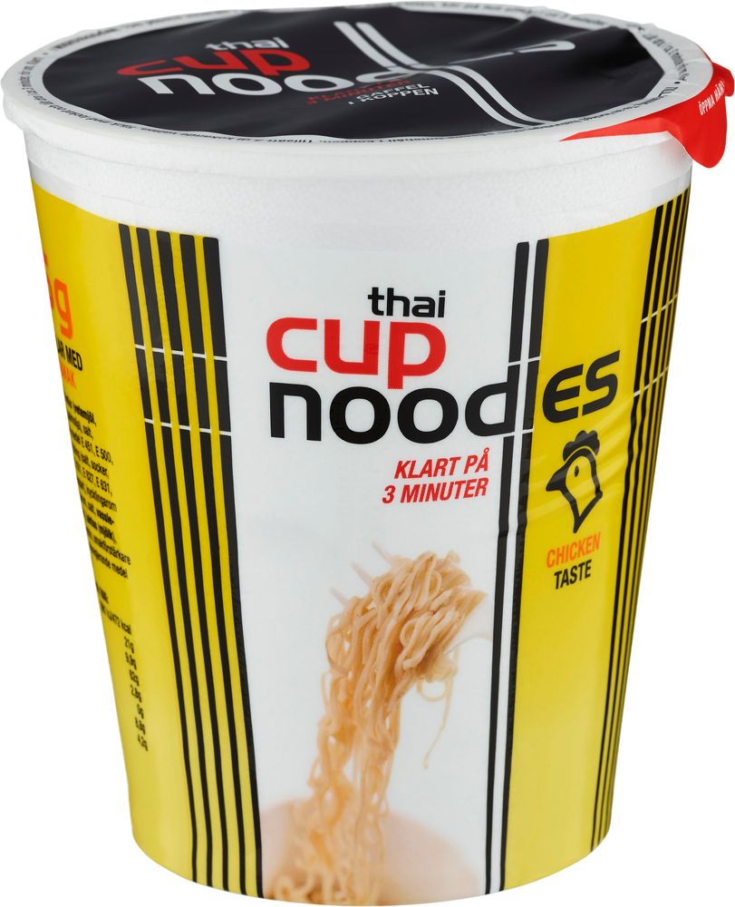 Thai Cup Noodles med smak av kyckling som är klara på bara tre minuter, perfekt när du vill få i dig någon god lunch eller mellanmål när du har bråttom. Med denna smidiga kopp slipper du dessutom disk!