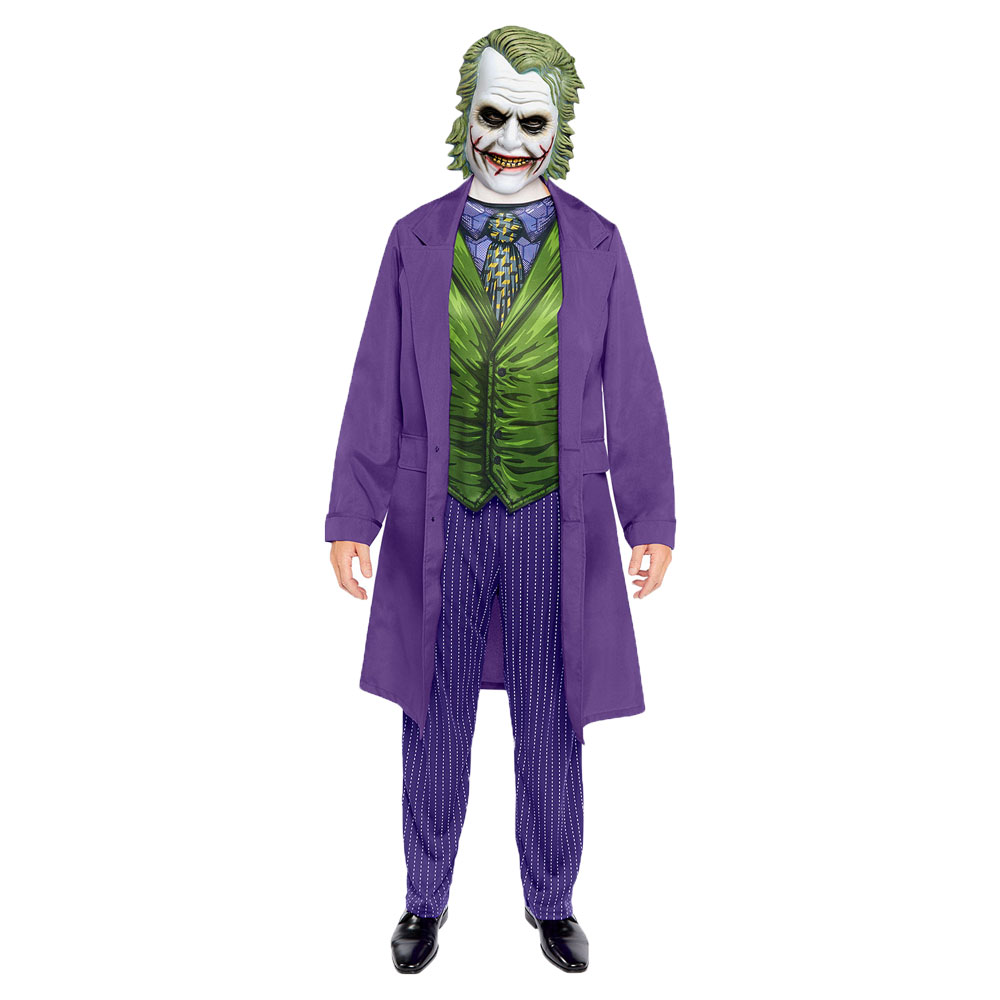The Joker Kostym omfattar en Jokern utklädnad för barn som består av en lila kavaj med fastsydd, grön väst, ett par matchande byxor med vita ränder samt en plastmask i form av Jokern. Masken täcker hela ansiktet, har hål för ögon, näsa och mun, och hålls på plats med hjälp av ett elastiskt band som träs runt huvudet. Dräkten är tillverkad av polyestermaterial.