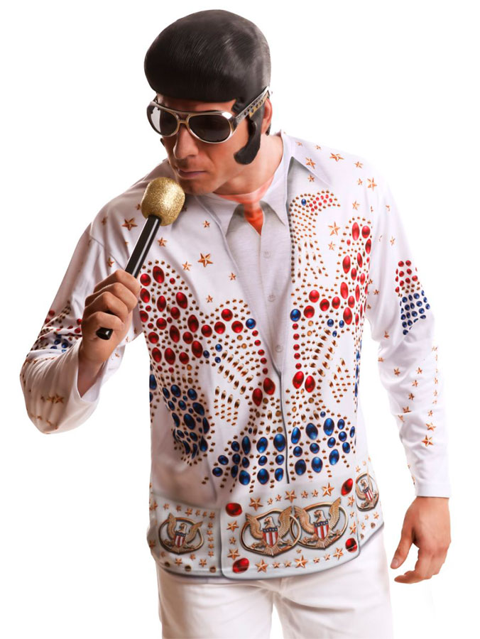 Om du drömmer om att bli en världsberömd rockstjärna så är denna supertuffa tröja något för dig! Med denna tröja förvandlas du nämligen till självaste The King på bara ett litet ögonblick. En snygg fotorealistisk tröja som enkelt kan matchas med exempelvis en passande peruk och byxor för en riktigt enkel, men supersnygg Elvis Presley dräkt.