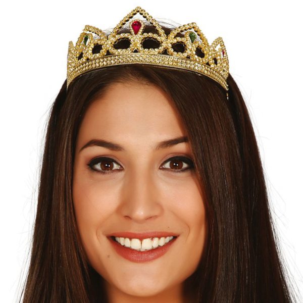 En vacker tiara i guld är den perfekta accessoaren för en möhippa eller maskerad. De juvelformade detaljerna i grönt och rosa skapar en elegant och festlig look som garanterat drar blickarna till sig.