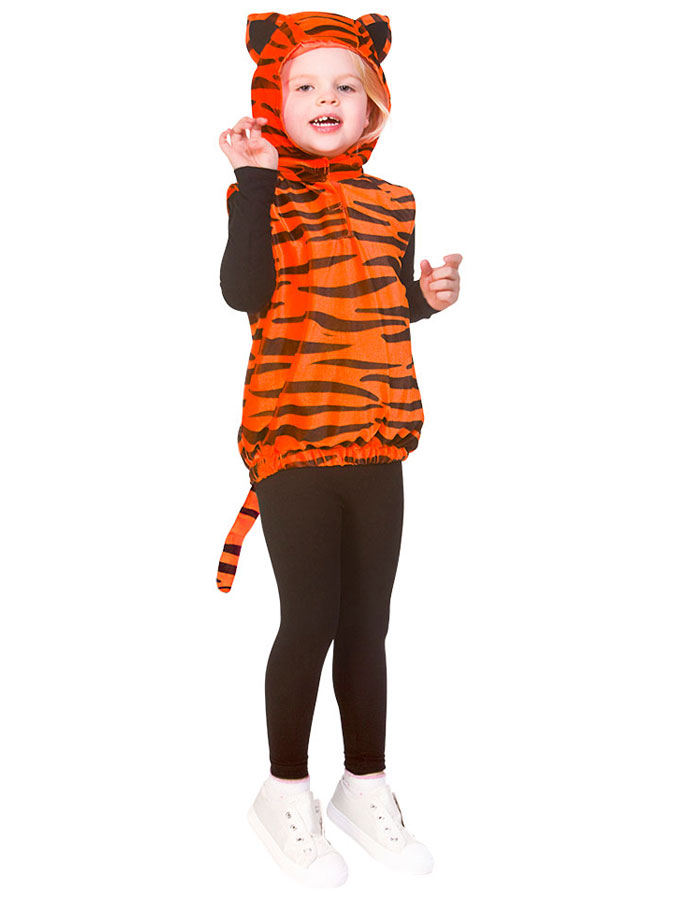 Tigerdräkt med Luva Barn innehåller en tigermönstrad väst i svart och orange med svans och söt luva med öron.