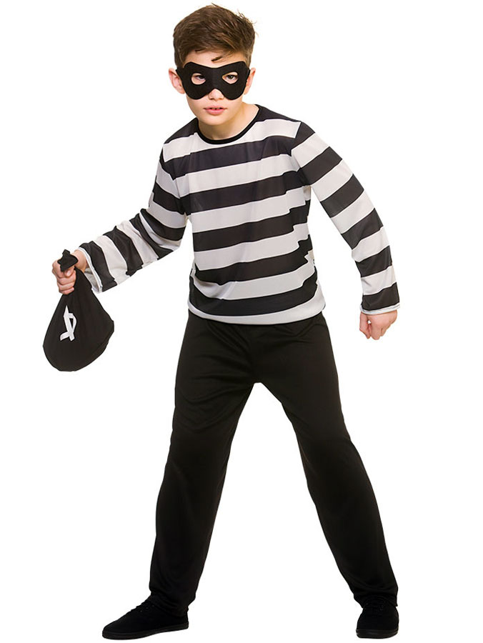 Medan alla andra barn springer omkring hus till hus och frågar snällt om godis, så har vi en bättre och mer effektiv lösning i form av denna tjuv dräkt för barn. Kliv in i grannskapets förbjudna land med tystlåtna fotsteg som inte ens tomten kan slå, och ta allt godis för dig själv! Undrar någon varför du är klädd som en tjuv så pekar du på det högljudda huset mittemot och yttrar ordet maskeraddräkt.