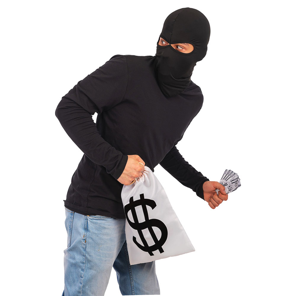 Tjuv Maskerad Kit omfattar ett set med accessoarer för en tjuv-utklädnad för maskerad med en rånarluva, låtsaspengar och en stor påse med dollartecken.