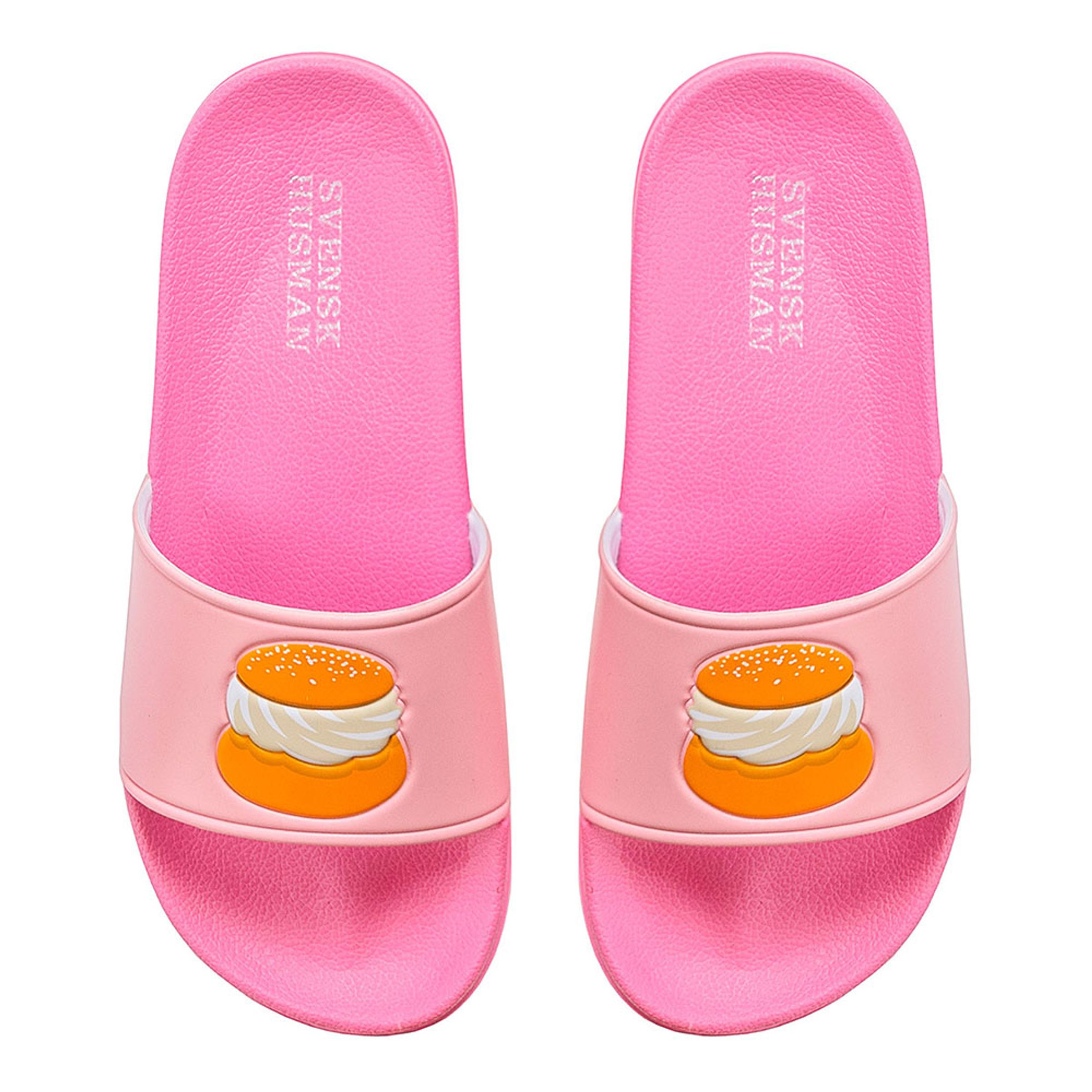 Tofflor Semla är i rosa och ljusrosa färg med motiv av en mumsig semla på vardera toffla. På hälarna är "Svensk Husman" tryckt. Passar lika bra på stranden eller att toffla runt ute i på sommaren, och är perfekta för den som älskar semlor helt enkelt!