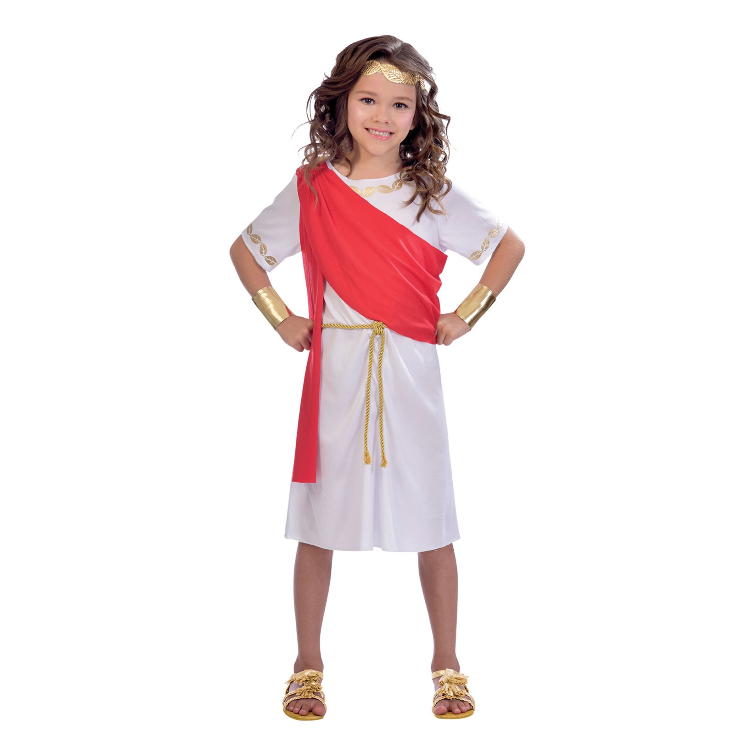 Toga Barn Maskeraddräkt inkluderar en vit tunika med snygga motiv av guldfärgade löv, en röd mantel och midjerep. Ingår gör också två guldskimrande handledsskydd och en matchande huvudbonad.