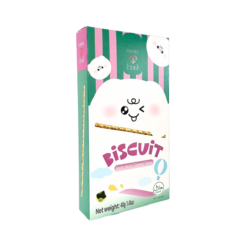 Tokimeki Biscuit Stick – Savoury Wasabi Seaweed Flavour: Krispiga kexpinnar med en smakrik blandning av wasabi och sjögräs. En spännande japansk smakupplevelse med en perfekt kombination av hetta och umami. Perfekt som ett unikt snack för alla som älskar att utforska nya smaker.