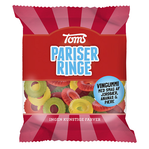 Toms Pariserringe, eller parisringar som det blir på svenska, består av vingummi formade som små ringar med smak av jordgubb, ananas och päron. Innehåller inga artificiella färgämnen!