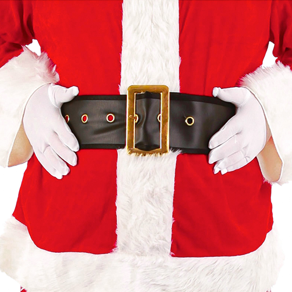 Tomtebälte Deluxe omfattar ett brett, läderliknande tomtebälte i svart med stort, guldigt metallspänne. Bältet är tillverkat av polyester och passar vuxna.