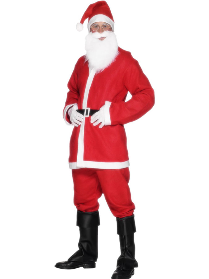 Tomtedräkten består av en enkel tomterock med vita kanter och ett par matchande röda byxor. Det medföljer dessutom ett svart justerbart bälte med ett vitt spänne av plast, en klassisk tomteluva samt ett fluffigt tomteskägg som fästs runt huvudet med resårband.